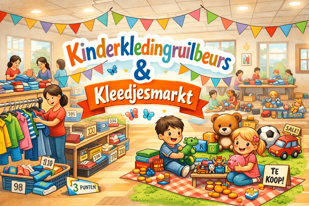 In maart 2026 organiseren we – op verzoek – opnieuw een kinderkledingruilbeurs. Dit jaar combineren we de ruilbeurs met een kleedjesmarkt voor kinderen. Een gezellig weekend waarin je kledingkasten kunt opruimen, speelgoed een tweede leven geeft en tegelijkertijd bijdraagt aan een goed doel.